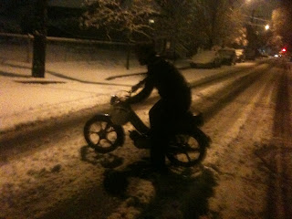 Maybe nine months ago Eric had never ridden a moped and thought they were dumb. This picture just shows how stoked he is about fixing his Tomos. We ran almost a full tank of gas through that bike after he tuned it up, all in the snow mind you. Its a great bike and its good to see it put to good use by some one who is only going to make it better and better.